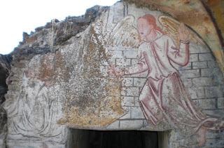 Abajo: imagen de los restos de la bóveda de arista donde se observa al único evangelista conservado de los cuatro que ilustrarían posiblemente toda la techumbre de la sala: San Lucas.