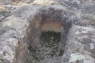 Arriba: detalle del nicho central del subgrupo compuesto por tres tumbas donde se aprecia el labrado del sepulcro, destacando en el mismo la oquedad limada como reposacabezas del difunto.