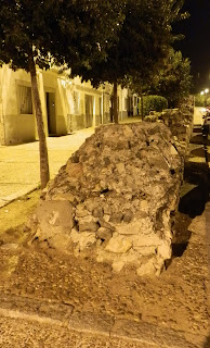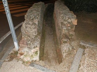 Arriba y abajo: vista nocturna del tramo conservado del Acueducto de Cornalvo o Aqua Augusta en la calle Vía Desengaño de la capital autonómica, uno de los escasos restos que de esta conducción de agua pervive hoy en día, observándose aún en él el canal por donde discurría el agua camino del Castellum Aquae, así como los materiales pétreos utilizados en su fábrica.