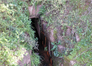 Arriba: a los pies de la Presa de Cornalvo aparece, en medio del talud de tierra que cubre esta obra de ingeniería aguas abajo, la boca de la galería que conecta con la Torre de Toma y a través de la cual se capta el agua del embalse, túnel cubierto con la sillería granítica original de apenas medio metro de anchura y poco más de metro y medio de altura.