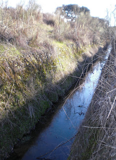 Arriba: aspecto que actualmente presenta el canal romano que conducía hasta el embalse de Cornalvo el agua recogida por la presa de Las Muelas, captando la del arroyo homónimo así como la de otras fuentes cercanas, cuyas canalizaciones han quedado en desuso frente a este conducto final, renovado y aún empleado.