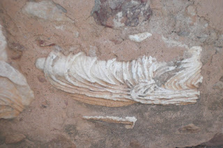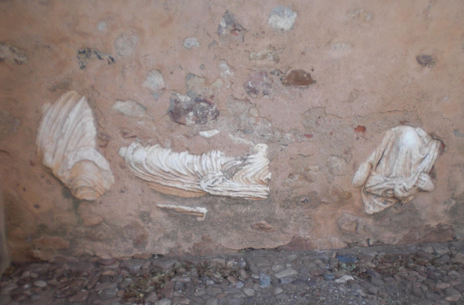 Arriba: de los tres togados romanos que subsisten engullidos en el muro oriental del Palacio de los Mexía, es el central el de mayor tamaño, figurando no sólo el torso del personaje sino también las piernas del individuo que representó.