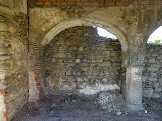 Arriba y abajo: vista general del muro de los pies y portada de acceso al sacro recinto desde el interior del inmueble, apreciándose sobre el latericio arco apuntado de entrada y los preservados quicios pizarrosos donde quedasen encajadas las hojas que sirvieran de puertas del templo (abajo), el diseño en arco de medio punto que dibujase los límites superiores de la pared (arriba), de donde partiese la bóveda de cañón que terminase cubriendo el religioso habitáculo, hoy desaparecida la obra original sustituida varios años atrás por una nueva fábrica en ladrillo que, junto al levantamiento de los arcos de sustentación faltantes y de las porciones de paredones laterales perdidos, intentase mejorar el estado de abandono y ruina con el que llegaría el bien a los confines del segundo milenio.