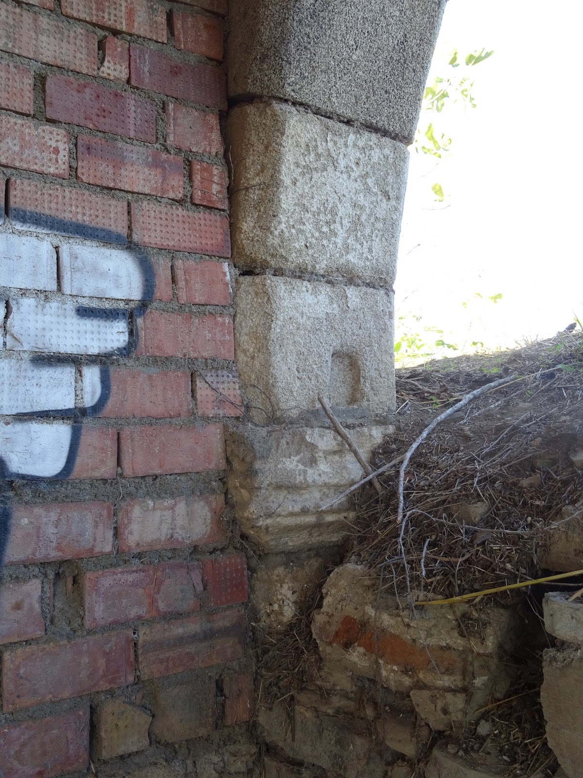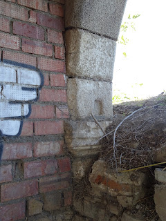 Arriba y abajo: sobresale por la esquina norteña de la portada el atrio de acceso a través de un arco contiguo y paralelo al muro de los pies del templo, seguido de otro girado frontalmente en ángulo recto a éste (arriba), semitapiados hoy en día sendos vanos mediante muros de mampostería que cierran la parte baja de los mismos hasta la línea de impostas, descubriéndose entre las piezas pétreas que conforman tales tabiques postreros las volutas graníticas que sirviesen como sujección del latericio arco más septentrional (abajo), cierre norteño de la galería.