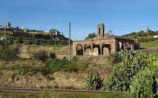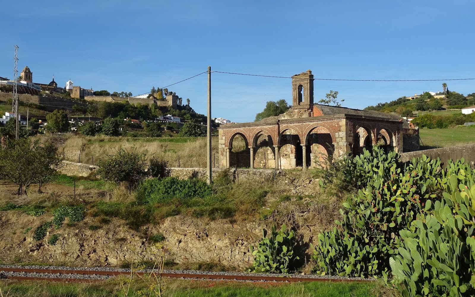 Abajo: mencionada por los visitadores de la Orden de Santiago, bajo cuya custodia había quedado la localidad desde que la misma fuese entregada en diciembre de 1.370 por el monarca Enrique II de Castilla a tal congregación de monjes-guerreros, cincuenta y ocho años después de que la Corona se hiciese cargo del municipio una vez disuelta la Orden del Temple que poco después de la reconquista del enclave gobernara la comarca, el hecho de aparecer la ermita de San Lázaro en el informe efectuado por los santiaguistas en 1.511 permite no sólo verificar la existencia del monumento a comienzos del siglo XVI, sino inclusive barajar su construcción tiempo atrás contándose como una de las ermitas medievales presentes a la llegada de la Edad Moderna, abiertas junto a la de San Lázaro también al culto durante mencionada visita de inspección las de Santiago y de los Santos Mártires, intramuros, así como en las cercanías la de Nuestra Señora de Aguas Santas, la dedicada a Santa María de Brovales, la de Santa Ana y la de San Benito, inicio de un largo listado de ermitas y capillas que aumentaría entre los siglos XVI y XVIII, once en funcionamiento litúrgico según el Interrogatorio de la Real Audiencia de Extremadura efectuado en 1.791, omitiéndose en éste el nombre de las mismas si bien Pascual Madoz, en su Diccionario geográfico-estadístico-histórico de España, las enumeraría en 1.850 sin que apareciese la ermita de San Lázaro en la relación, suponiéndose así el abandono a mediados del siglo XIX de la misma, posiblemente a raíz de las medidas desamortizadoras ejecutadas a mediados de las decimonónica década de los 30.
