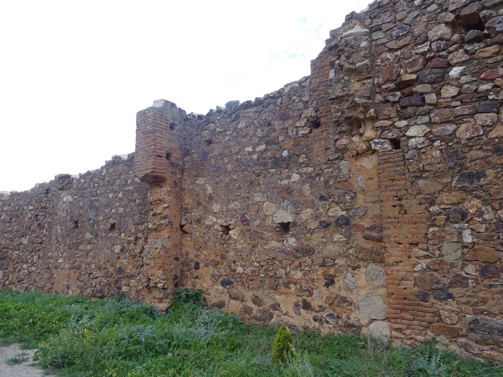 Arriba y abajo: sobria y sin vestigios de lucido externo, salvo en la portada norteña, la Ermita del Espíritu Santo de Oliva de Mérida muestra sin pudor en su exterior la constitución de su fábrica edilicia, apreciándose en su flanco meridional (arriba), al que se enlazan los menudos vestigios del habitáculo que hiciese las funciones de sacristía (abajo), la mampostería de sus muros a base de cuarcitas y dioritas, propias de la comarca, reforzadas por ladrillos en contrafuertes y esquinas (abajo, siguiente), figurando en los cuatro ángulos que enmarcan la mole total del alargado monumento sillares graníticos entre los que sorprenden ciertas piezas reutilizadas (abajo, imagen tercera), adivinándose en la esquina noroccidental, entre pies del templo y lado del evangelio, lo que pareciese ser un sillar antaño base de alguna estatua votiva (abajo, imagen cuarta), rescatada quizás de algún añejo santuario pagano que existiera en los alrededores de la población oliveña.