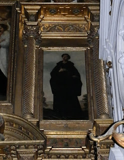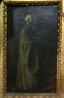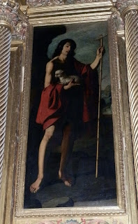 Abajo: además del Cristo de Llerena y las otras dos obras pertenecientes al retablo llerenense conservadas en el Museo de Bellas Artes de Badajoz, nunca sin olvidar la incalculable obra que del pintor puede admirarse en el interior del Monasterio guadalupense, existe en Extremadura otro conjunto zurbaranesco expuesto dentro de la Iglesia de la Candelaria de Zafra, formando parte del conocido como Retablo de Nuestra Señora de los Remedios, encargado en 1.644 por el hidalgo local y corregidor Alonso de Salas Parra para ornamentar los sepulcros suyo y de su esposa, realizando para ello Francisco de Zurbarán una serie iconográfica que quedaría centrada por la Virgen imponiendo la casulla a San Ildefonso, enmarcada entre un San Miguel y un San Nicolás de Tolentino, y coronada por la Sagrada Familia o Doble Trinidad, mientras que en el cuerpo inferior del retablo, enmarcando una imagen escultórica, figurarían San Juan Bautista en la calle izquierda, y San Jerónimo penitente en el lado contrario, todo ello sustentado por una pedrela donde dos pequeñas obras sobre San Andrés y San Bernabé quedan custodiadas por los retratos de los mecenas, atribuyéndose el busto masculino a Zurbarán, pero no el de la esposa de Alonso de Salas, Jerónima de Aguilar, pintado al parecer por un seguidor de Pacheco.