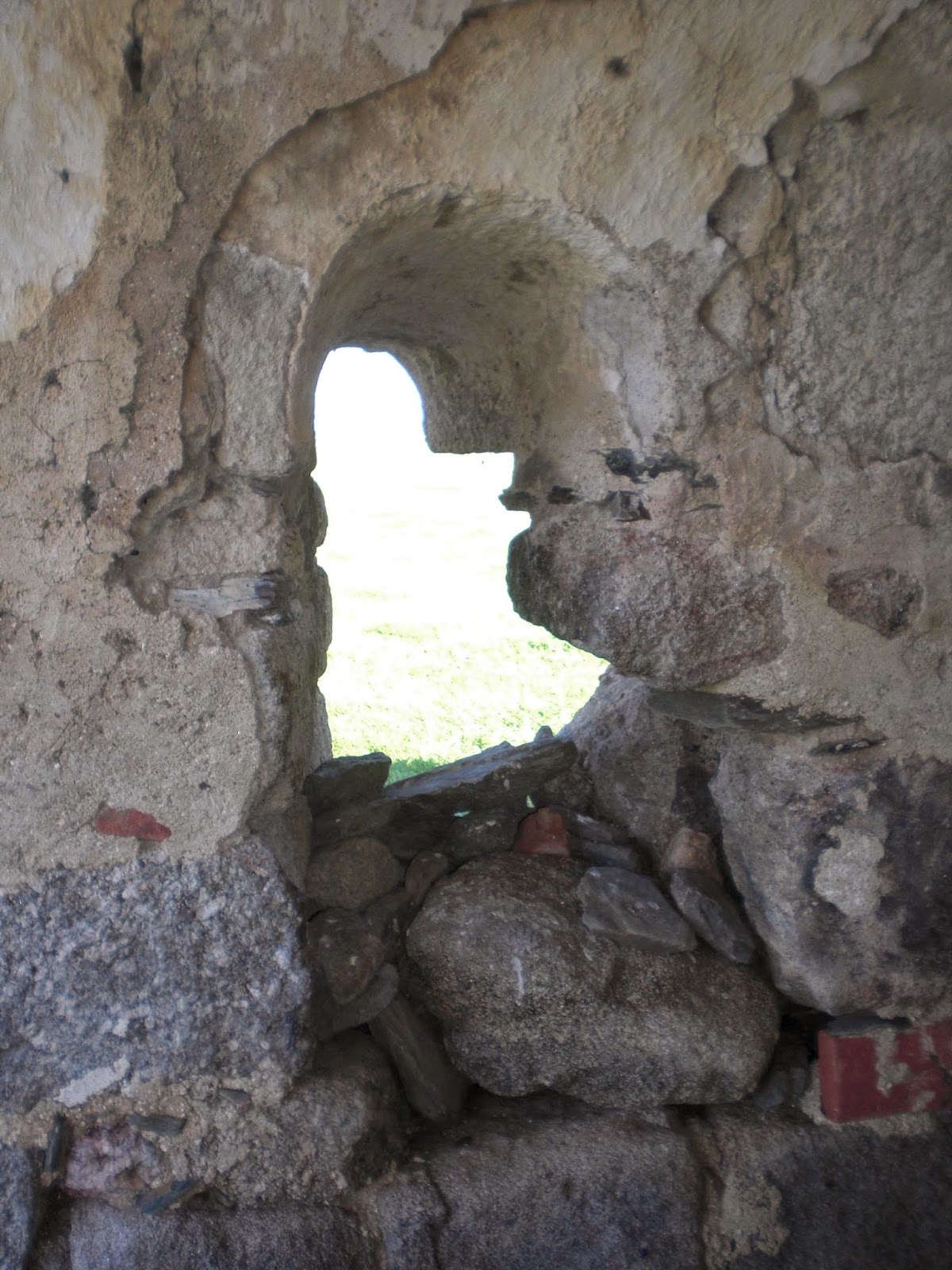 Arriba y abajo: tres pequeños vanos de reducidas dimensiones, permitirían antaño el acceso de luz al interior del ábside de la Ermita del Santo, abiertos los vanos uno en cada uno de los laterales del rectangular recinto, cuyo arco exterior quedaría coronado con una única pieza granítica (arriba), mientras que en su cara interna se presentarían circundados por una tallada cenefa triangular (abajo), de similar relieve a la vestigial ornamentación subsistente en otros rincones del lugar.