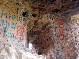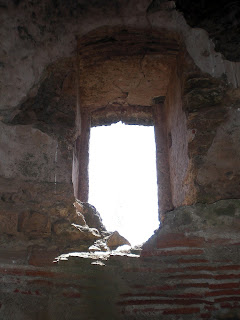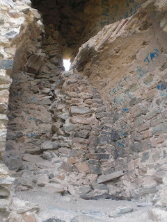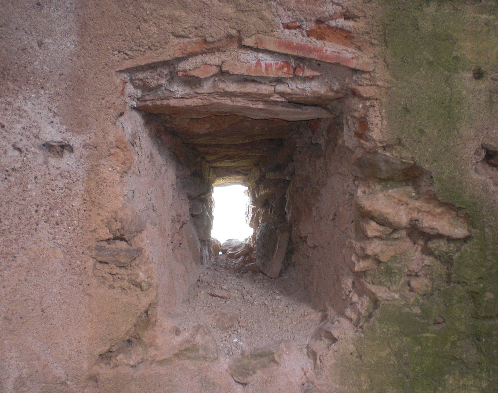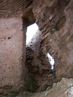 Arriba: labrado en la pared se conserva el estrecho paso que permitía la comunicación entre las plantas alta e inferior, destinada posiblemente esta última al almacenaje, mientras que la superior se mantendría como lugar de refugio y hogar de los militares y tropas allí apostados.