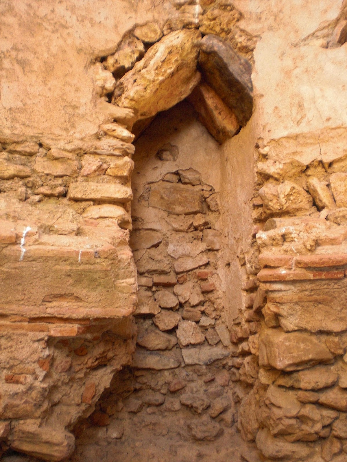 Arriba y abajo: dos portadas decoradas con pilastras, hornacinas y otros tantos elementos ornamentales fabricados en ladrillo y yeso en conjunción con el resto de decoración conservada en el templo del convento, permitirían la entrada al recinto sacro desde su lado más norteño, cegada hoy la más occidental (abajo), mientras que sobre la oriental sobrevivirían restos de decoración pictórica fragmentada por la bóveda de arista que cierra el atrio, invitando así a pensar que tal techumbre, unida a la vivienda sita sobre ella, pudieran datarse en fechas posteriores a la apertura original de los vanos.