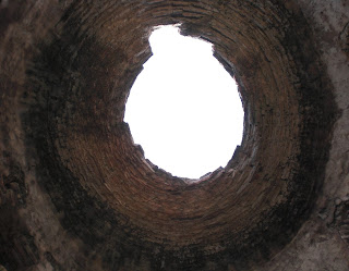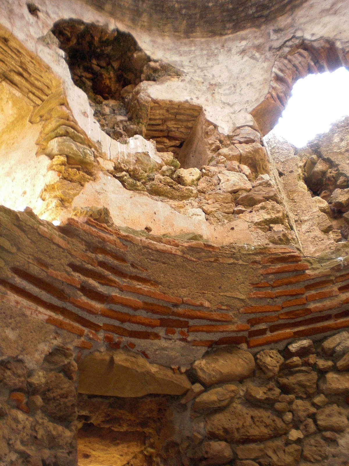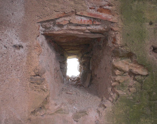 Arriba y abajo: al contrario que en otras atalayas, tales como la de las Moitas, cuyas bóvedas se componen casi en su integridad por lajas de pizarra unidas siguiendo la técnica de "colmo", en la torre vigía de Juana Castaña sería el ladrillo el material que forjase la fábrica de sus techumbres, desmoronada en su zona central la bóveda de la estancia superior, y casi desaparecido en su totalidad el cubrimiento de la habitación baja.