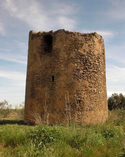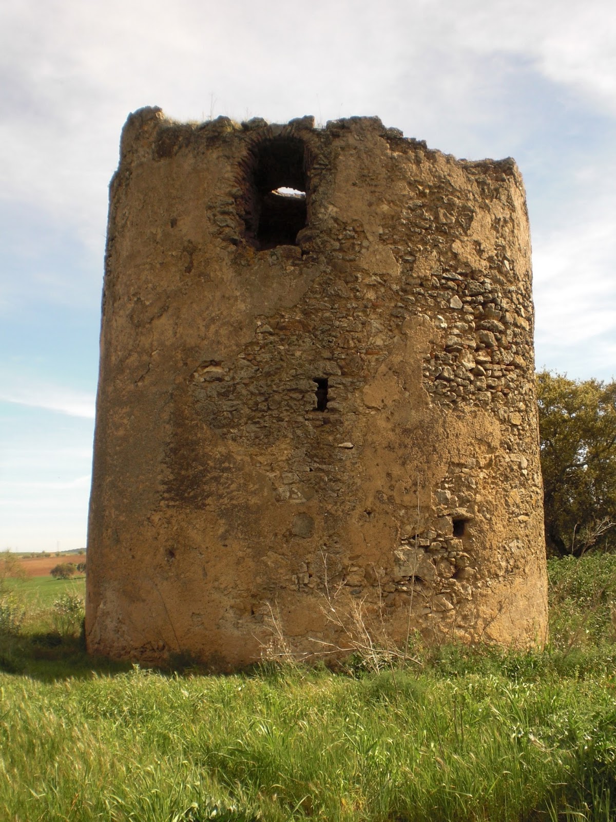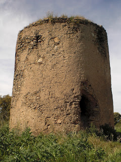 Abajo: la atalaya de las Moitas presenta características constructivas similares al resto de arquitecturas vigías con que se circundó a Olivenza en plena Guerra de Restauración, de planta circular y anchos muros de pétrea mampostería, únicamente horadados en base a una dotación de aspilleras defensivas y dos grandes vanos que vigilarían los puestos amigos y enemigos respectivamente, a través de los cuales poder escalar hacia su interior, entrada hoy facilitada a través de una gran hoquedad nacida a raíz de un presunto temblor que sacudió la región el pasado siglo, dejando al descubierto los secretos internos del edificio.