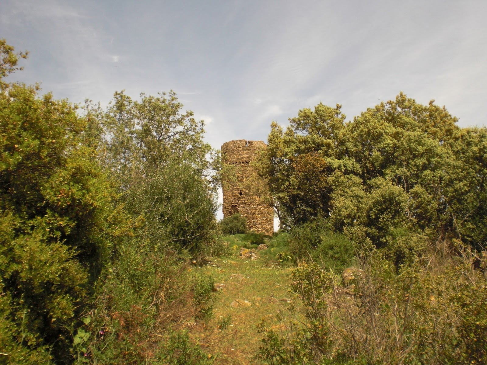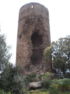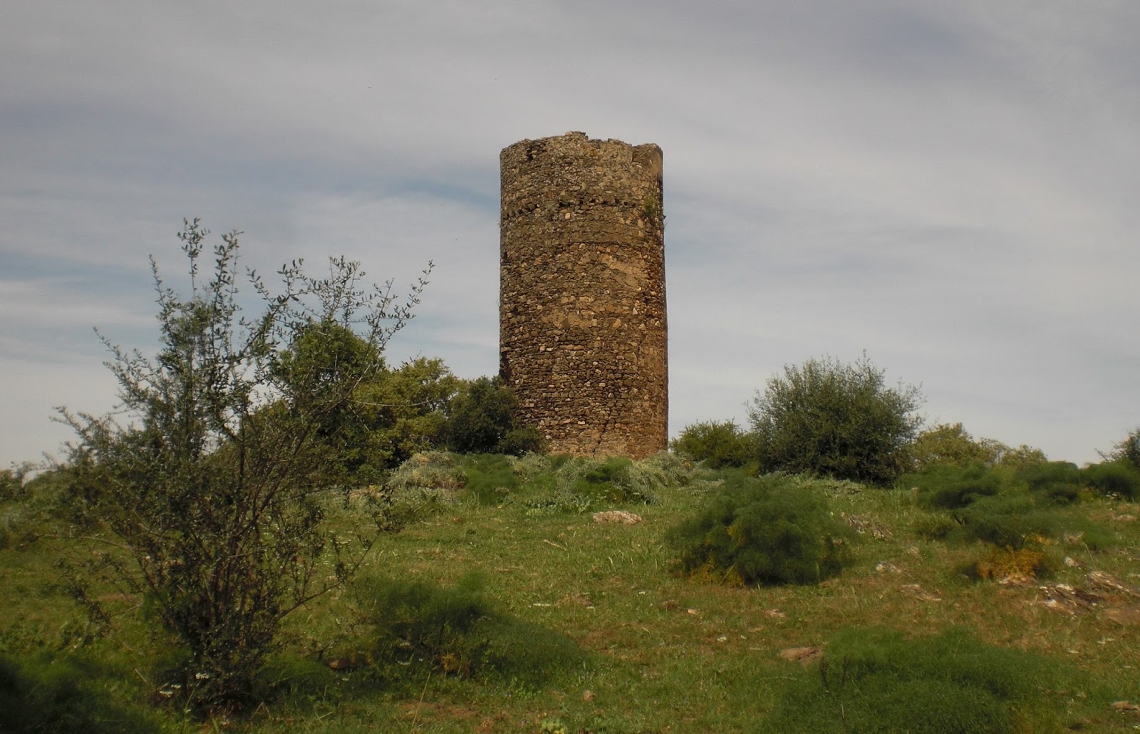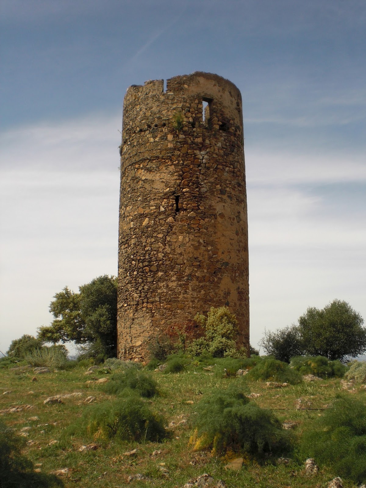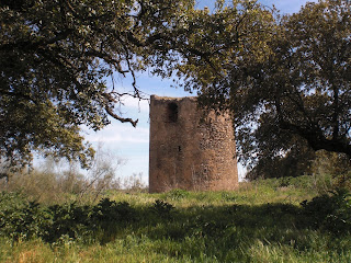 Arriba: rodeada de arbustos, la atalaya de las Moitas recibe por tal motivo su nombre en luso, anclada en plena dehesa extremeña desde la que nos mira orgullosa de su gran altura, máxima entre las torres vigías oliventinas conservadas hoy en día.