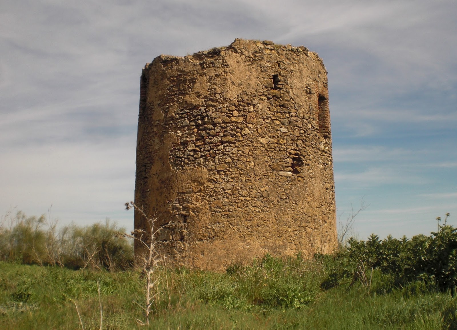 Arriba y abajo: la atalaya de Juana Castaña repite directrices arquitectónicas similares al resto de torres vigías oliventinas, tales como su planta circular o su fábrica basada en gruesos muros de mampostería pétrea, constando ésta, sin embargo, de menor altura que otras de las conservadas en nuestros días, lo que no ha impedido, sin embargo, que su integridad y la conservación de elementos tales como el enlucido externo, sea mucho mayor y mejor que la presentada por otras atalayas.
