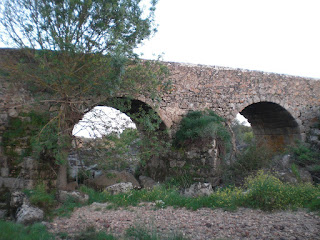 Arriba: el puente del Notario o de la Notaria, nombrado así por la finca cercana, conocido igualmente como de Guadarranque, por superar antes de su derrumbe las aguas del homónimo afluente del río Gévora, serviría antaño como paso a los viajeros que discurrieran por el camino que comunicaba Alburquerque con La Codosera, cercana ésta con la frontera lusa, recibiendo igualmente a través de él las cargas de harina que, fabricada en los abundantes molinos que salpicaban la vega del Gévora, nutrían una destacada industria dentro de la villa alburquerqueña.