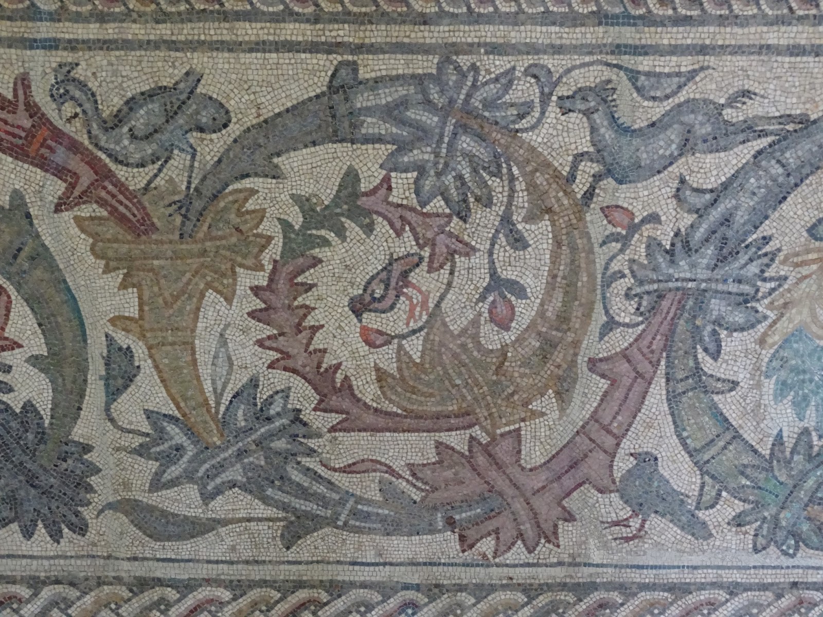 Abajo: dando la bienvenida al visitante que decide conocer el Museo Arqueológico Provincial de Badajoz, el mosaico de Orfeo, rescatado del presunto tablinum de la villa de Pesquero (16.), se presenta como una de las obras musivas de mayor calidad artística de entre las encontradas en la provincia y región, centrada por el mítico príncipe tracio rodeado de los animales a los que deleita con su lira, en una iconografía repetida en otras obras musivas a lo largo de Hispania o del Imperio (como los hallados en Caesar Augusta o Zaragoza, Antioquía o Palermo), encuadrada la escena por cenefas, florones, roleos vegetales y otros diseños pavimentales donde se aprecia el fabuloso trabajo, la eficiencia técnica y la riqueza compositiva, en todo un tesoro arqueológico para Extremadura.