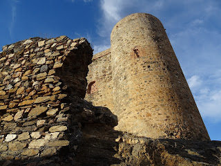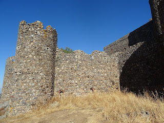 Arriba: el muro diafragma que dividía la fortaleza en dos, desaparecido el lienzo occidental que unía muralla con el flanco de poniente de la torre del homenaje, culmina en su extremo de levante en un torreón circular desde el cual, tanto antaño como hoy en día, se puede divisar la penillanura del Guadiana, abierta a los pies nororientales de la sierra donde se asienta el castillo.