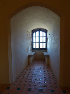 Arriba y abajo: es en el torreón sur donde se descubre el ventanal mejor conservado de los del piso superior del castillo de Villalba de los Barros, diferentes a los bajos por su elaborado diseño mudéjar, apreciándose en éste, el occidental de los dos abiertos en tal torre, un llamativo arco de herradura (abajo).