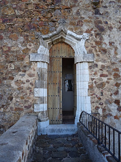 Arriba: también ejecutada en mampostería, como el propio castillo nogaleño, una cerca unida al castillo se erigió alrededor de la llanura abierta al frente de su portada meridional, alcanzando la parroquia de San Cristóbal y abarcando los terrenos que actualmente acogen el cementerio municipal y la plazuela de acceso a la fortaleza, antiguo enclave que, en época de refundación de la localidad desplazada de los contornos del vecino arroyo, acogería las viviendas de los primeros colonos, de esta manera defendidos.