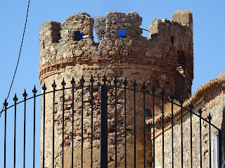 Arriba: Torre de Miguel Sesmero, antiguamente conocida como Torre de Almendral, toma su propio nombre, al parecer, de la existencia de una fortaleza que defendería la población, demolida en 1.841 y de cuyo derribo únicamente se salvaría un torreón de planta semicircular, reacondicionado como vivienda y ubicado junto al actual Paseo de Extremadura.