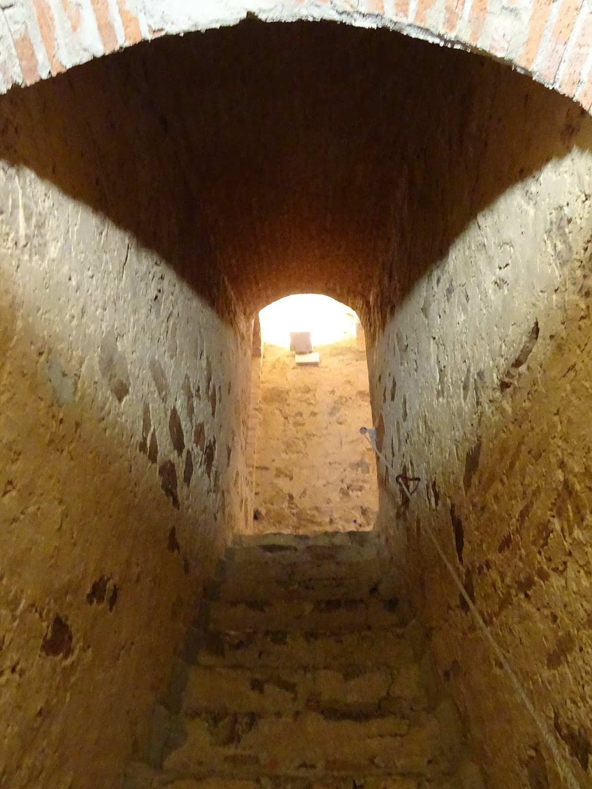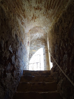 Arriba: pensado también como método defensivo del edificio principal del castillo de Feria, el acceso y comunicación entre plantas dentro de la torre del homenaje se realizaría a través de estrechas escaleras, partiendo desde la planta segunda, primera desde el exterior, tanto al piso bajo, como al tercero, y de éste al nivel cuarto y terraza del inmueble (abajo).