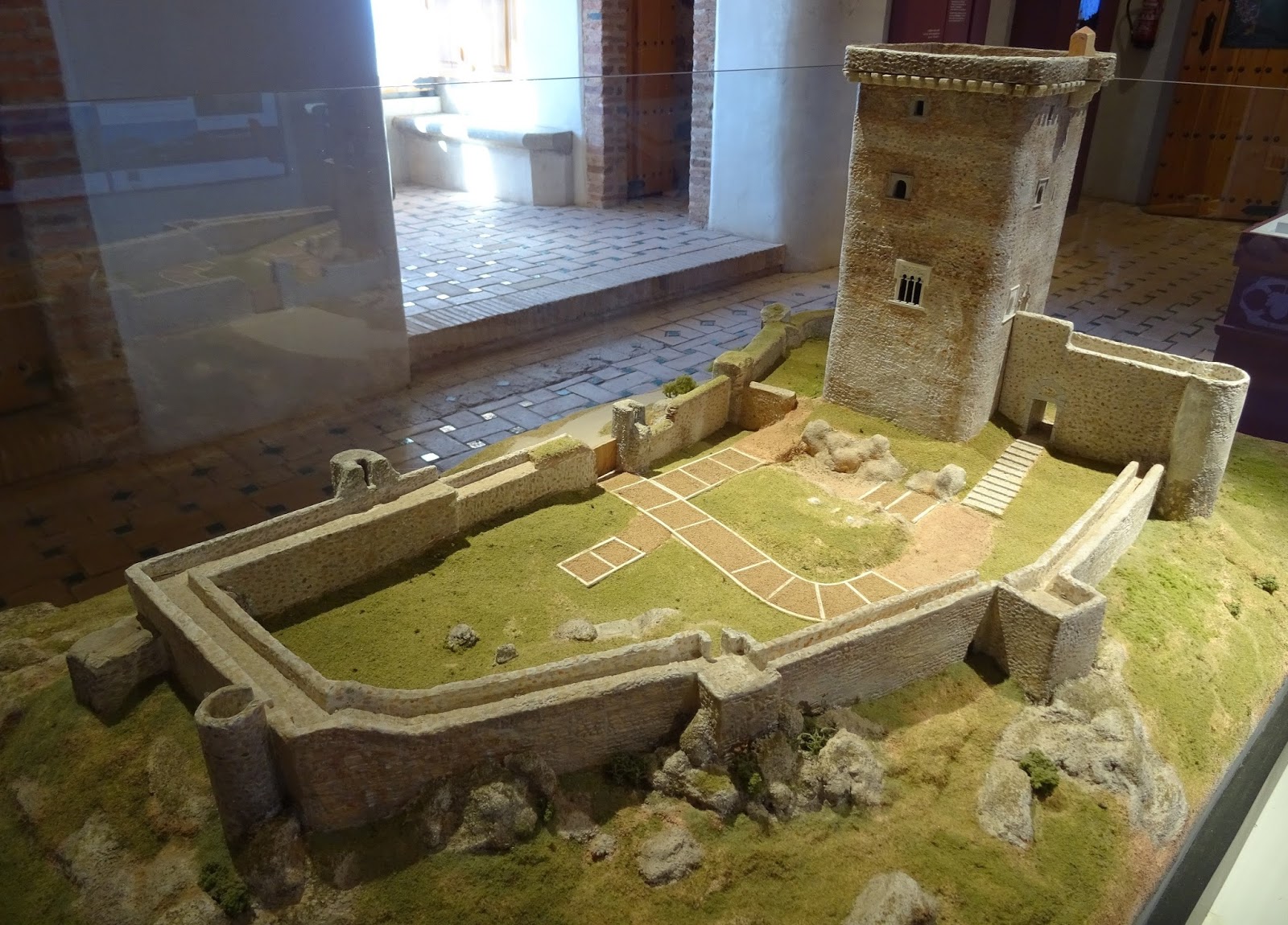 Arriba y abajo: tras el cercado que sella el segundo recinto, un tercer espacio asoma desde la muralla, cerrado al público por el carácter privado del monumento, donde destaca el edificio erigido en la zona norteña, así como los dos altos torreones que lo custodian en su flanco occidental, semicilíndricos como el resto de los levantados en la obra y donde se puede descubrir el uso del ladrillo fundamentalmente en marcos de puertas y vanos.