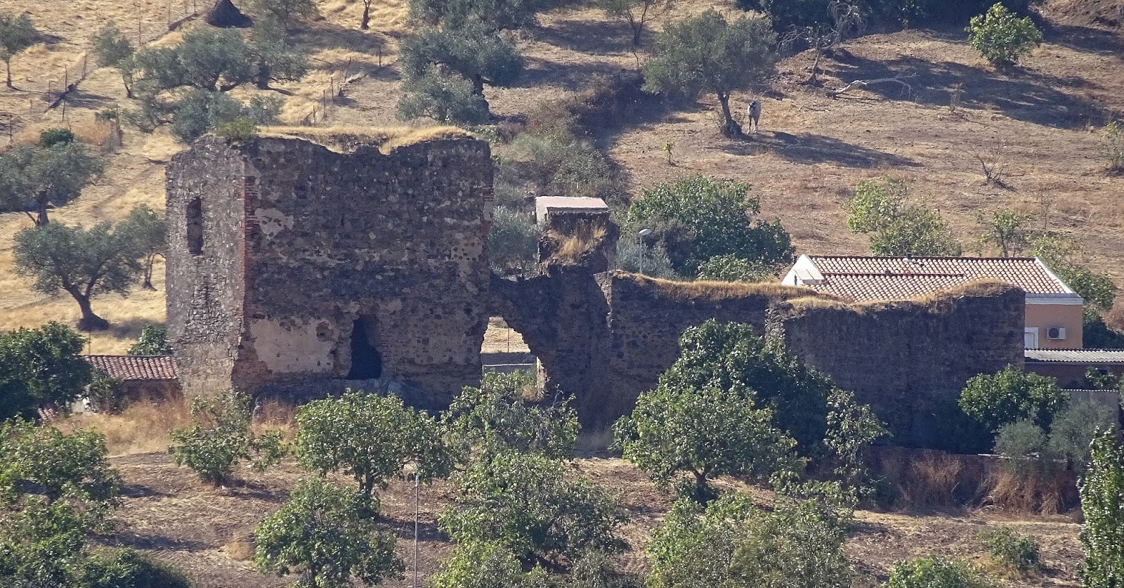 Arriba: en manos privadas actualmente, el castillo de Los Arcos se encuentra formando parte de una explotación agropecuaria, adaptada la antigua fortaleza a vivienda y dependencias del caserío, ubicado el monumento en la zona norteña del actual conjunto cortijano.