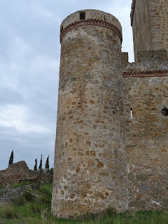 Arriba y abajo: vista general del flanco suroccidental del castillo de Villalba, cuyo diseño, repetido en los flancos suroriental (abajo) y nororiental, se basa en la ubicación de torreones huecos y circulares en las esquinas del cubo de que consta el edificio, apoyados en su labor defensiva por torreones macizos enclavados en los puntos medios de cada lateral mencionado.