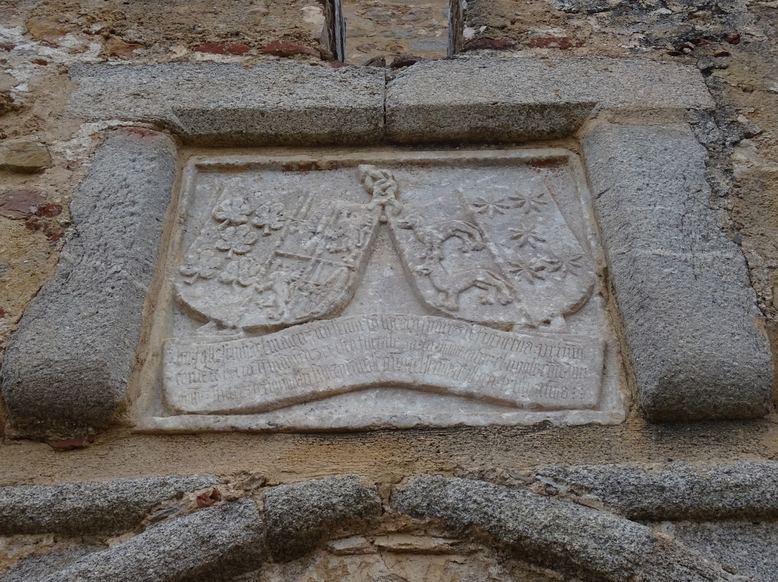 Arriba y abajo: la portada principal de entrada al recinto se abriría en el flanco suroriental del sistema de amurallamiento, fabricada con sillares graníticos dispuestos bajo diseño gótico alcanzando un arco apuntado delimitado por alfiz (arriba), sobre el cual sería colocado, rodeado igualmente por piezas de granito, una placa marmórea donde, además de lucir los emblemas de la familia con escudos doblados de los Figueroa-Manuel y los Osorio-Rojas, quedaría registrado el término de las obras de ejecución del castillo en el año de 1.464 (abajo).