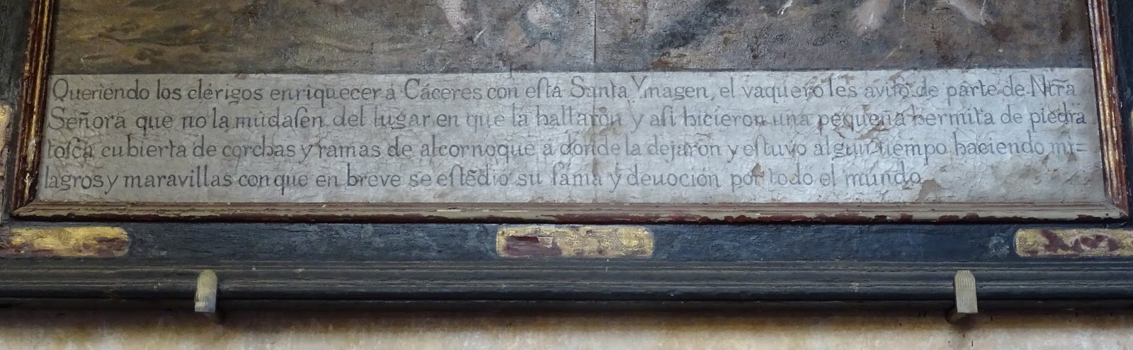Gregorio I, posteriormente canonizado como San Gregorio Magno, obsequiaría a su amigo San Leandro de Sevilla con la milagrosa talla, llegando así la escultura a una Península Ibérica regida entonces por el poder visigodo, portada por el propio San Isidoro tras la estancia de éste en Roma, no reocgido el traspado de propiedad ni de estancia de la imagen por la colección guadalupana, al igual que el supuesto milagro que durante la travesía se daría tras calmarse una tempestad en que se vería inmerso el navío que transportaba obra y eclesiástico. Establecida la escultura en la ciudad hispalense, la incursión de las tropas mahometanas en suelo hispano haría que los clérigos sevillanos, tal y como se narraría en el tercero de los lienzos, huyesen hacia el Norte con la misma, escondiéndola en un paraje donde siglos más tarde, según el cuarto cuadro, una vez reconquistadas las tierras de lo que fuese Extremadura, un pastor de Cáceres, cuyo nombre no menciona Fray Juan de Santa María aun ya siendo conocido desde el siglo XVI mas no popularizado hasta el XVIII, diese con un res perdida y fallecida, dándose una nueva intervención sobrenatural mariana al resucitar el animal en el mismo momento en que Santa María se apareciese al vaquero, ordenándole volver al lugar con clérigos cacereños a fin de excavar en dicho paraje en busca de la milenaria talla. Para convencimiento del extraordinario suceso en la entonces villa cacereña, sería también por Santa María resucitado el hijo del pastor, fallecido en ausencia de éste, nada más llegar el mismo al hogar y encomendarse a lo divino. Visto el suceso y narrado lo acontecido en la sierra, partiría el vaquero con cierto número de clérigos de vuelta al lugar de la aparición mariana, dando el pastor con la sacra talla tras cavar en el punto exacto en que diese con la finada vaca, levantando inmediatamente entre todos una precaria y humilde capilla para alojarla.